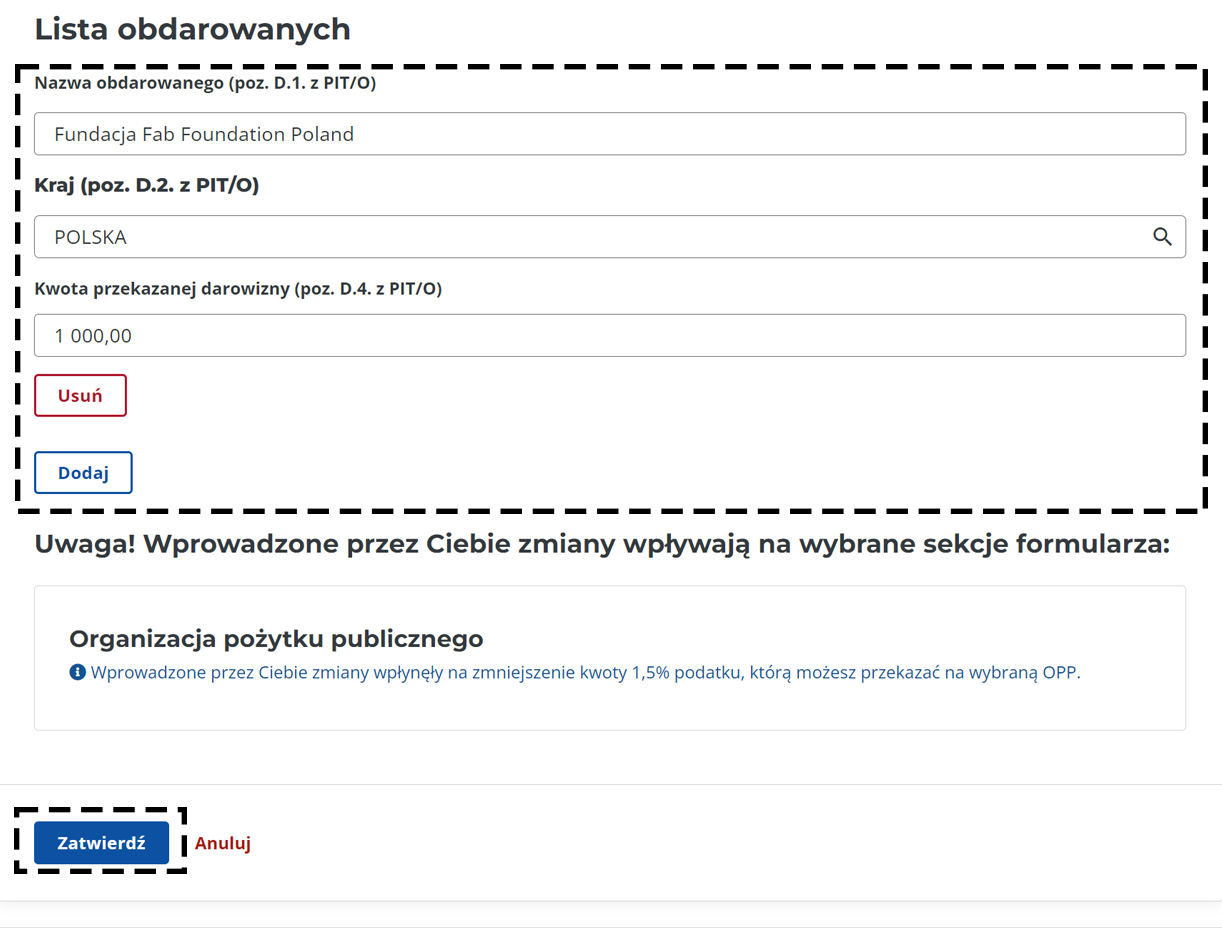 5. Uzupełnij pola Nazwa obdarowanego(...): Fundacja Fab Foundation Poland, Kraj(...): Polska, Kwota przekazanej darowizny (...): wpisz kwotę przekazanej nam darowizny. Następnie kliknij Dodaj. Uwaga! Lista obdarowanych to lista wszystkich organizacji, którym przekazałeś darowizny - wymień je wszystkie wraz z adekwatnymi kwotami. Następnie kliknij Zatwierdź. Jeśli przekazywałeś 1,5% podatku na organizację OPP, otrzymasz komunitkat jak poniżej. Kliknij Zatwierdź.