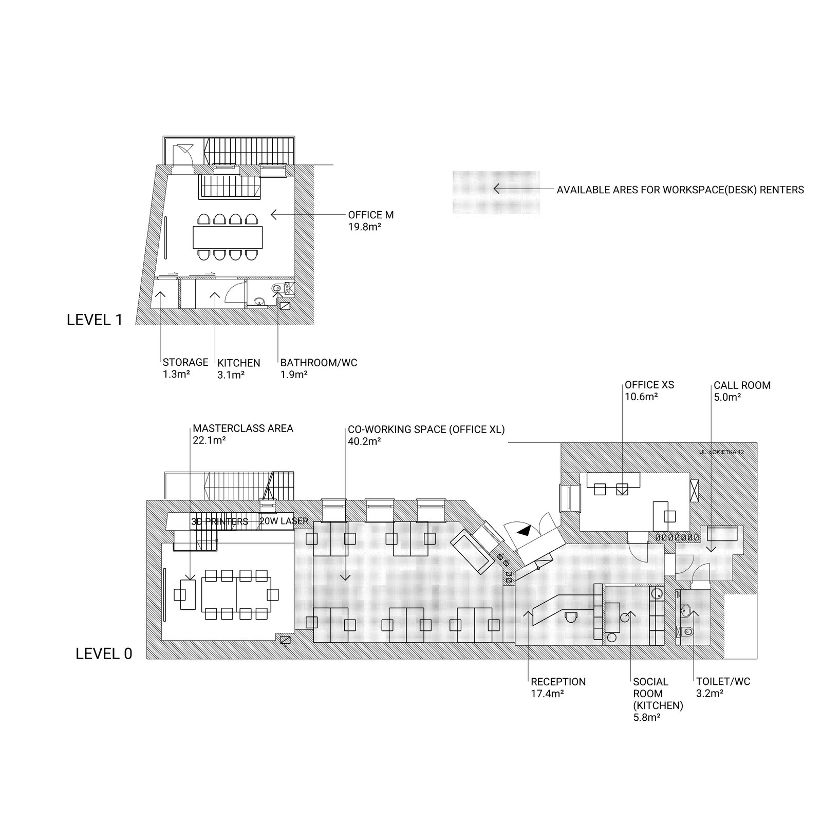 - area: an individual dedicated workspace in the large co-making area including large comfortable desk 140x70cm, chair and a desk cupboard