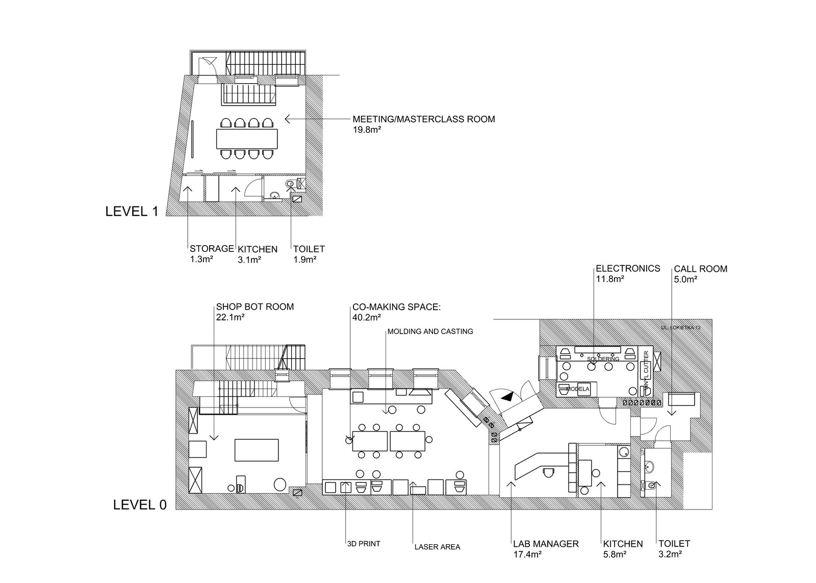 We are working on finding proper spaces and establishing new Fab Lab facilities in Poland. We are looking for the spaces of around 100-500m2 with preferably 3.5-4m height. The model fablab spaces are sketed below. The provided drawings were prepared based on the how to start a fab lab.