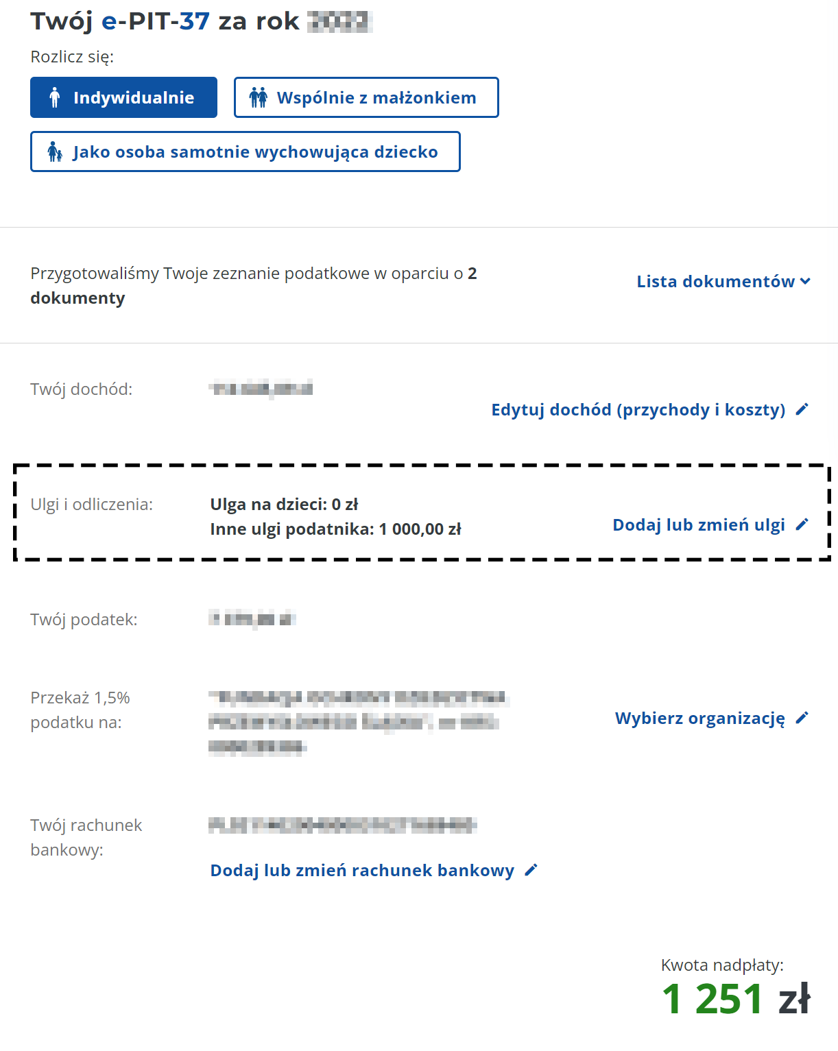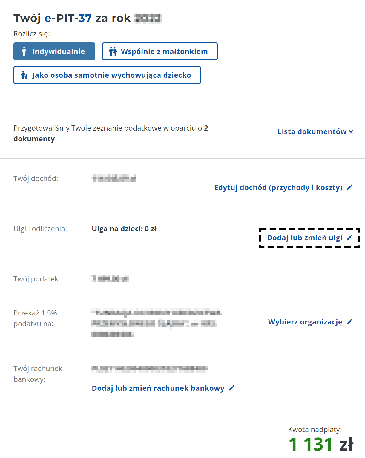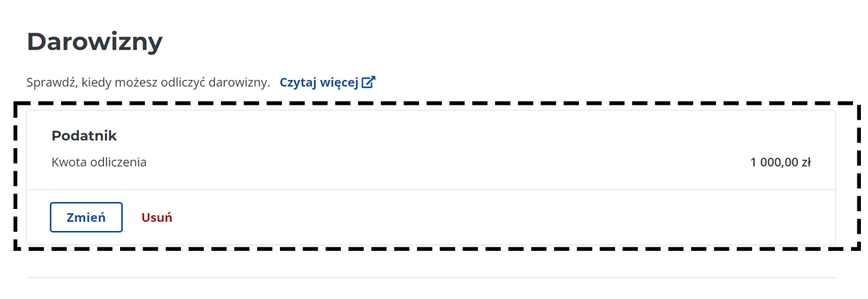 6. W sekcji Darowizny powinieneś zobaczyć swoją kwotę odliczenia.