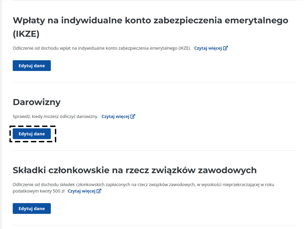 2. Z listy dostępnych ulg, kliknij Edytuj dane w sekcji Darowizny.