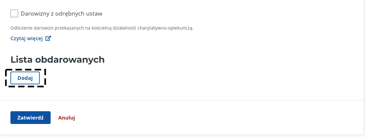 5. Uzupełnij pola Nazwa obdarowanego(...): Fundacja Fab Foundation Poland, Kraj(...): Polska, Kwota przekazanej darowizny (...): wpisz kwotę przekazanej nam darowizny. Następnie kliknij Dodaj. Uwaga! Lista obdarowanych to lista wszystkich organizacji, którym przekazałeś darowizny - wymień je wszystkie wraz z adekwatnymi kwotami. Następnie kliknij Zatwierdź. Jeśli przekazywałeś 1,5% podatku na organizację OPP, otrzymasz komunitkat jak poniżej. Kliknij Zatwierdź.